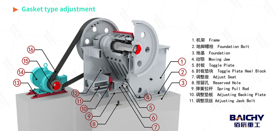 Older or smaller jaw crushers (e.g., traditional PE series jaw crusher) often use toggle plate adjustment. It’s less precise but still effective for basic operations.